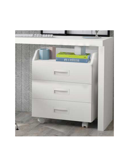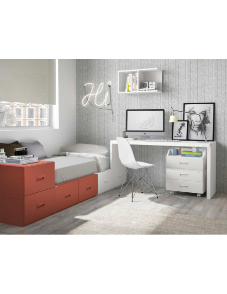 Mesita de noche con chaflán y tres cajones, con base de ruedas para habitaciones juveniles totalmente personalizable. Con estas piezas podrás elegir los colores base, los frentes de los cajones y los tiradores que más combinen con el dormitorio o la idea de dormitorio que quieras.