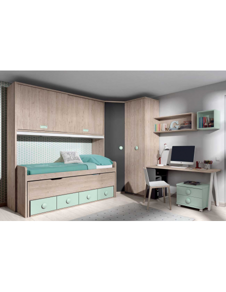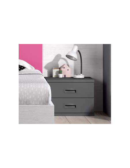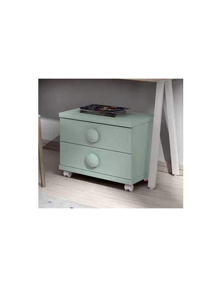 Mesita de noche con dos cajones y base sencilla o con ruedas para habitaciones juveniles totalmente personalizable. Con estas piezas podrás elegir los colores base, los frentes de los cajones y los tiradores que más combinen con el dormitorio o la idea de dormitorio que quieras.