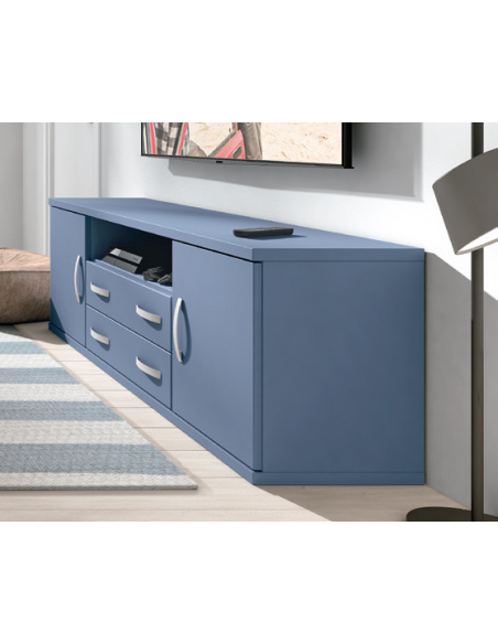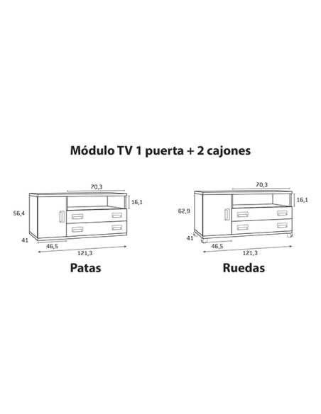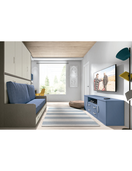Módulo auxiliar TV pequeño con base sencilla o con ruedas para habitaciones juveniles totalmente personalizable. Con estas piezas podrás elegir los colores base, los frentes de los cajones y los tiradores que más combinen con el dormitorio o la idea de dormitorio que quieras.
