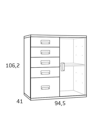 Sinfonier con cuatro cajones y un contenedor, una puerta y con base sencilla o con ruedas para habitaciones juveniles totalmente personalizable. Con estas piezas podrás elegir los colores base, los frentes de los cajones y los tiradores que más combinen con el dormitorio o la idea de dormitorio que quieras.