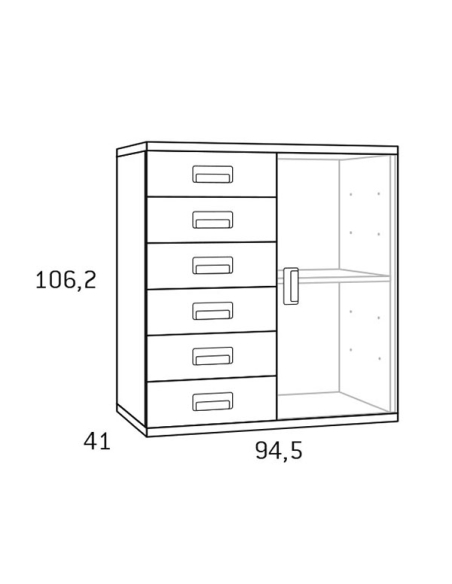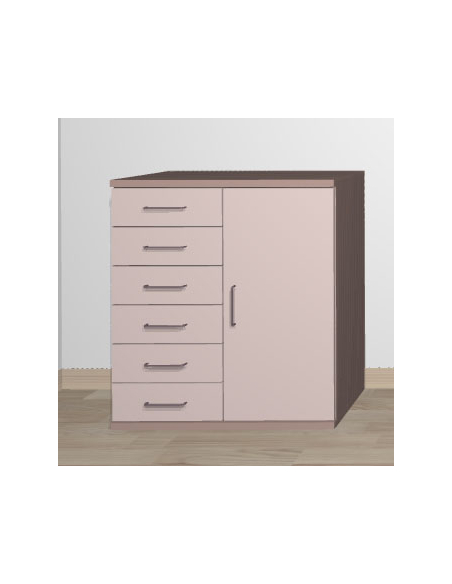 Sinfonier de seis cajones y una puerta con base sencilla o con ruedas para habitaciones juveniles totalmente personalizable. Con estas piezas podrás elegir los colores base, los frentes de los cajones y los tiradores que más combinen con el dormitorio o la idea de dormitorio que quieras.