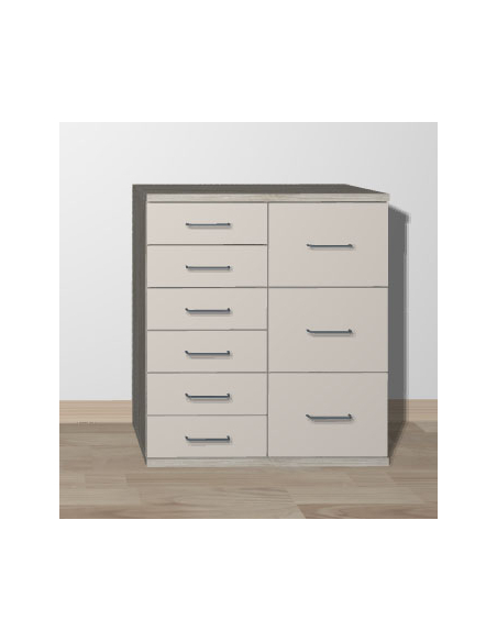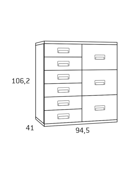 Sinfonier con seis cajones y tres contenedores con base sencilla o con ruedas para habitaciones juveniles totalmente personalizable. Con estas piezas podrás elegir los colores base, los frentes de los cajones y los tiradores que más combinen con el dormitorio o la idea de dormitorio que quieras.