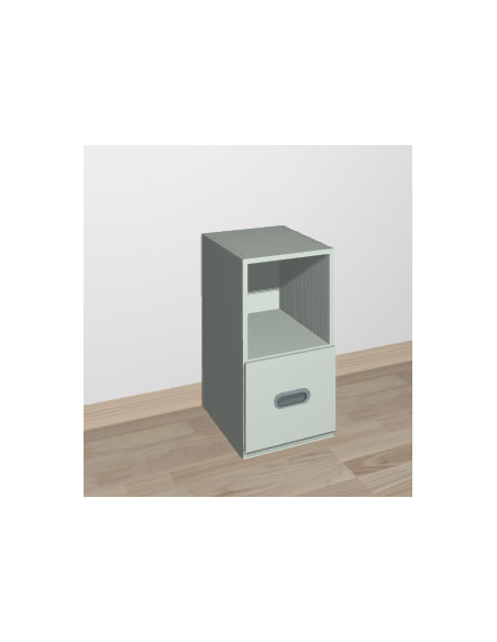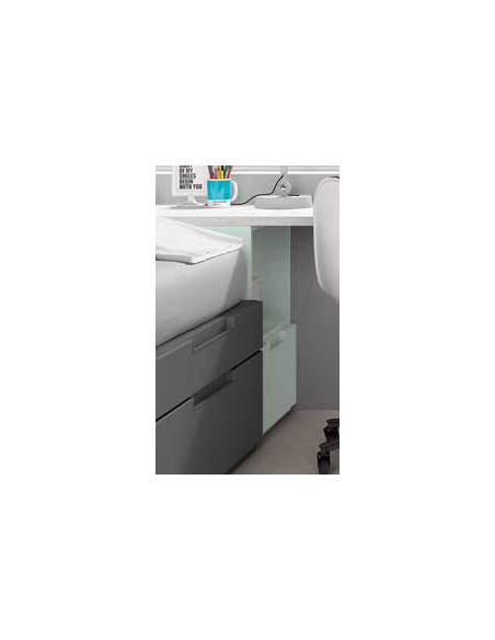 Bajo mesa estudio con contenedor y un hueco para habitaciones juveniles totalmente personalizable. Con estas piezas podrás elegir los colores base, los frentes de los cajones y los tiradores que más combinen con el dormitorio o la idea de dormitorio que quieras.