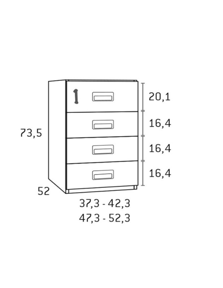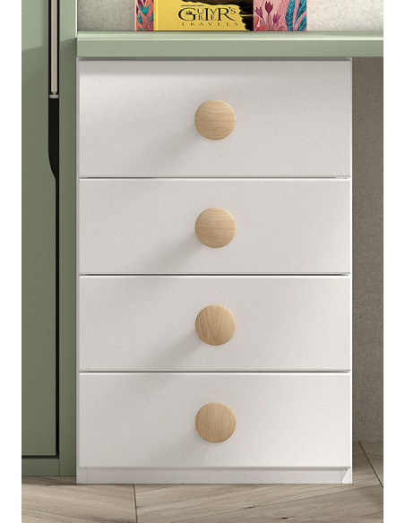 Bajo mesa estudio de cuatro cajones para habitaciones juveniles totalmente personalizable. Con estas piezas podrás elegir los colores base, los frentes de los cajones y los tiradores que más combinen con el dormitorio o la idea de dormitorio que quieras.