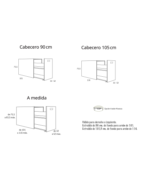 ↔ A medida de 32 a 52 cm ↗ de 101 a 116 cm ↕ de 73,5 a 83,5 cm -se puede pedir en la medida exacta dentro de los tramos indicados, hay que indicar la medida exacta en comentarios
