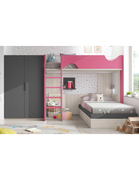 Si estas buscando amueblar la habitación juvenil de forma divertida y que haga las delicias a tu hij@, te proponemos esta sencilla litera bicolor con quitamiedos con formas y escalera al suelo. Posibilidad de hacer la combinación de colores y tiradores que más te gusten dentro de la amplia gama que ofrece el fabricante.