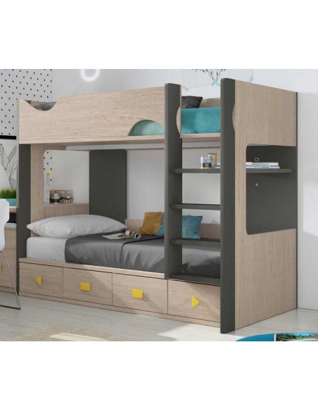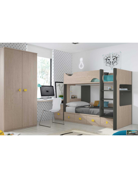 Si estas buscando amueblar la habitación juvenil de forma divertida y que haga las delicias a tu hij@, te proponemos esta sencilla litera bicolor con quitamiedos con formas, escalera al suelo y cuatro contenedores. Posibilidad de hacer la combinación de colores y tiradores que más te gusten dentro de la amplia gama que ofrece el fabricante.