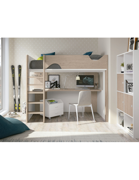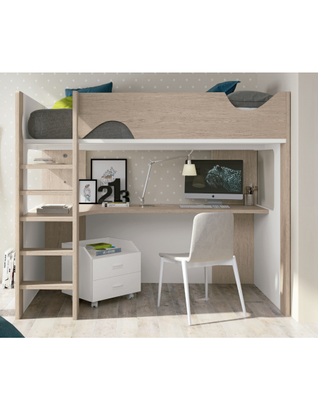 Si estas buscando amueblar la habitación juvenil de forma divertida y que haga las delicias a tu hij@, te proponemos esta sencilla litera bicolor con encimera de estudio y escalera al suelo. Posibilidad de hacer la combinación de colores y tiradores que más te gusten dentro de la amplia gama que ofrece el fabricante.