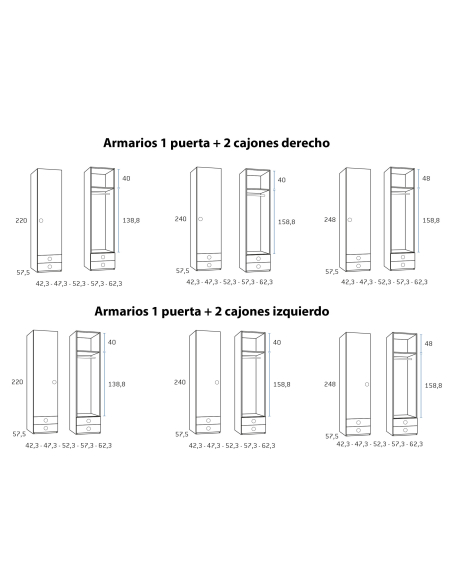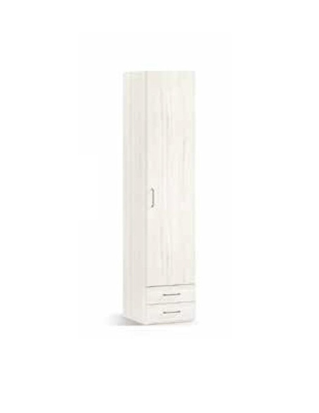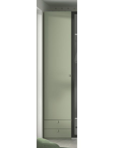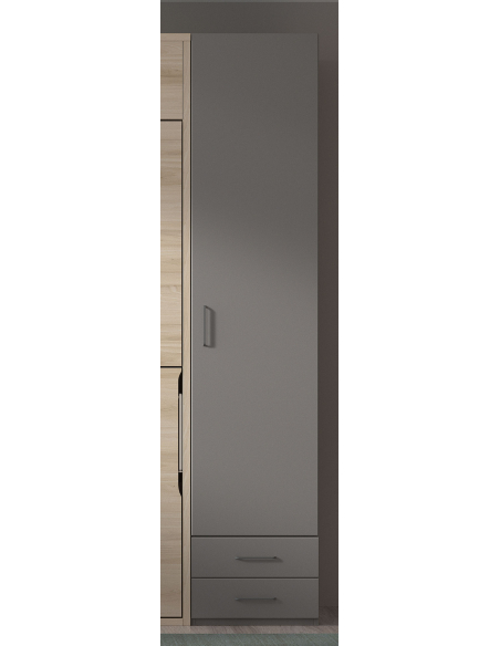 Armario juvenil 1 puerta dos cajones vistos, disponible en cinco anchuras diferentes a partir de 42,3 cm, y tres alturas, 220, 240 y 248 cm, combinables entre sí. Echa un vistazo a los acabados para las puertas y combínalo con el tirador que más te guste.
