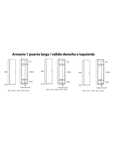 Armario juvenil 1 puerta larga, disponible en cinco anchuras diferentes a partir de 42,3 cm, y tres alturas, 220, 240 y 248 cm, combinables entre sí. Echa un vistazo a los acabados para la puerta y combínalo con el tirador que más te guste.