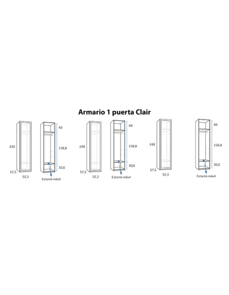 Armario juvenil 1 puerta larga modelo Clair, disponible en tres alturas, 220, 240 y 248 cm y 52,3 cm de ancho.