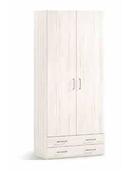 Práctico armario de dos puertas batientes y dos cajones vistos con sistema de freno, con el cual conseguirás tener todo en orden y organizado en un reducido espacio. El interior es un módulo con una barra para colgar la ropa y estante maletero. Un imprescindible en las habitaciones tanto a nivel organizativo como compositivo.