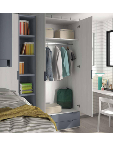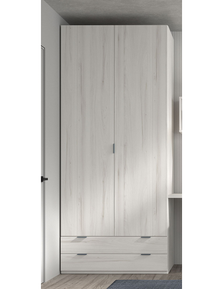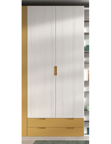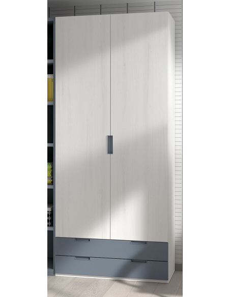 Armario juvenil 2 puertas dos cajones vistos, disponible en tres anchuras diferentes a partir de 84,1 cm, y tres alturas, 220, 240 y 248 cm, combinables entre sí. Echa un vistazo a los acabados para las puertas y combínalo con el tirador que más te guste.