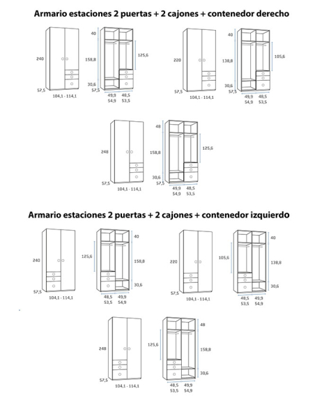 Práctico armario estaciones de dos puertas, dos cajones y un contenedor con el cual conseguirás tener todo en orden y organizado en un reducido espacio. Este armario esta dividido en dos partes, una parte con dos cajones y un contenedor vistos y en la parte superior interior estante maletero con barra de colgar y la otra parte estante maletero, estante inferior y una barra para colgar la ropa. Un imprescindible en las habitaciones tanto a nivel organizativo como compositivo.