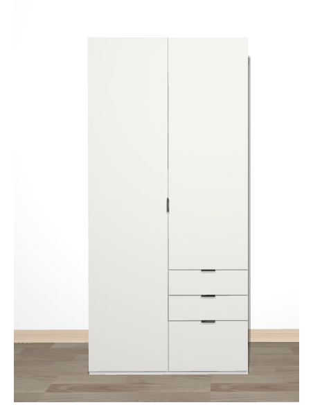Armario juvenil asimétrico de 2 puertas, 2 cajones y 1 contenedor, disponible en dos anchuras diferentes 104,1 y 114,1 cm, y tres alturas, 220, 240 y 248 cm, combinables entre sí. Echa un vistazo a los acabados para las puertas y combínalo con el tirador que más te guste.
