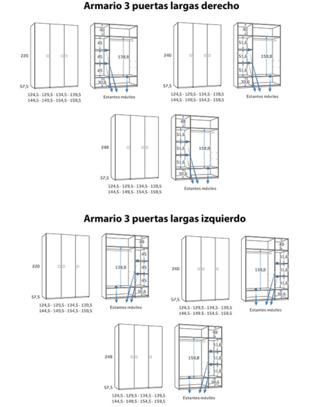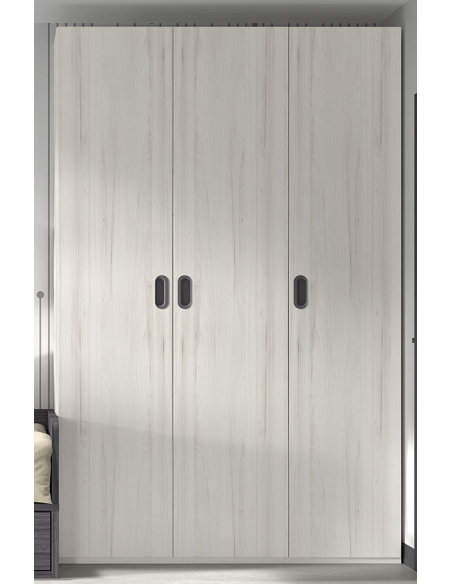 Armario juvenil 3 puertas largas, disponible en ocho anchuras diferentes a partir de 124,5 cm, y tres alturas, 220, 240 y 248 cm, combinables entre sí. Echa un vistazo a los acabados para las puertas y combínalo con el tirador que más te guste.