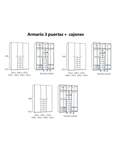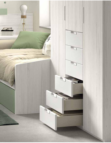 Armario juvenil 3 puertas y seis cajones vistos, disponible en siete anchuras diferentes a partir de 124,5 cm, y tres alturas, 220, 240 y 248 cm, combinables entre sí. Echa un vistazo a los acabados para las puertas y combínalo con el tirador que más te guste.