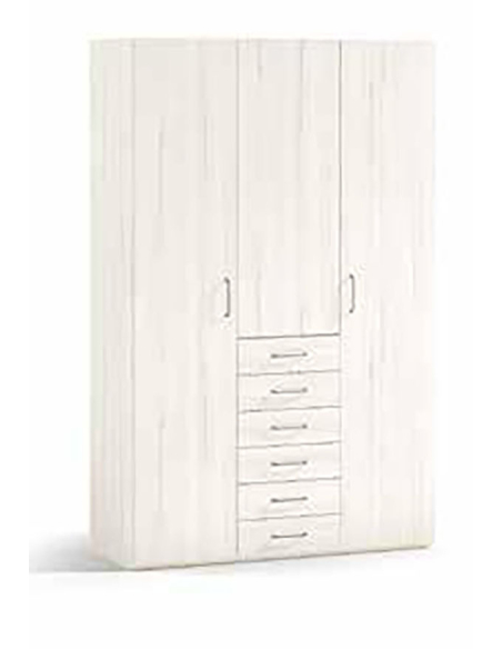 Práctico armario de tres puertas batientes y seis cajones vistos con sistema de freno en la parte central, con el cual conseguirás tener todo en orden y organizado en un reducido espacio. Dividido en tres cuerpos, el central con 6 cajones vistos y en la parte superior tres huecos y los dos módulos laterales están compuestos por un estante móvil para colocarlos a la medida que nos interese y en la parte superior estante maletero con una barra para colgar la ropa. Un imprescindible en las habitaciones tanto a nivel organizativo como compositivo.