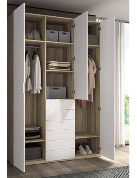 Práctico armario de tres puertas batientes y tres contenedores vistos con sistema de freno en la parte central, con el cual conseguirás tener todo en orden y organizado en un reducido espacio. Dividido en tres cuerpos, el central con 3 contenedores vistos y en la parte superior tres huecos y los dos módulos laterales con un estante móvil para colocarlo a la medida que nos interese y en la parte superior estante maletero con una barra para colgar la ropa. Un imprescindible en las habitaciones tanto a nivel organizativo como compositivo.