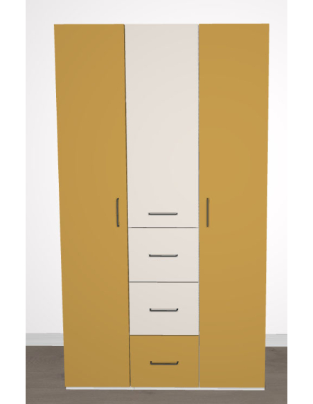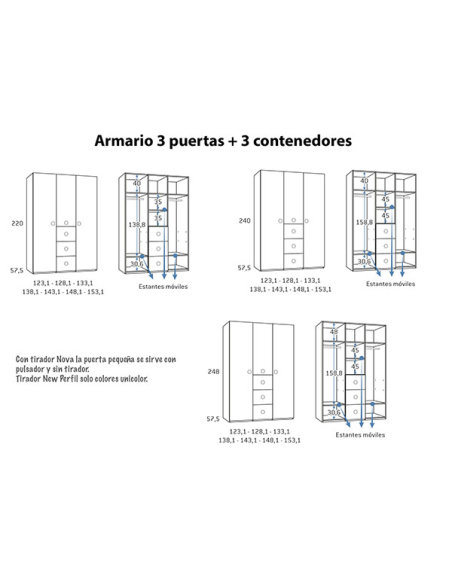 Armario juvenil 3 puertas y 3 contenedores vistos, disponible en siete anchuras diferentes a partir de 124,5 cm, y tres alturas, 220, 240 y 248 cm, combinables entre sí. Echa un vistazo a los acabados para las puertas y combínalo con el tirador que más te guste.