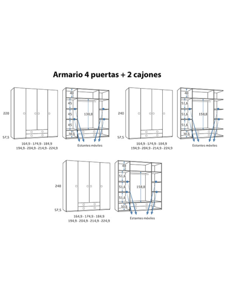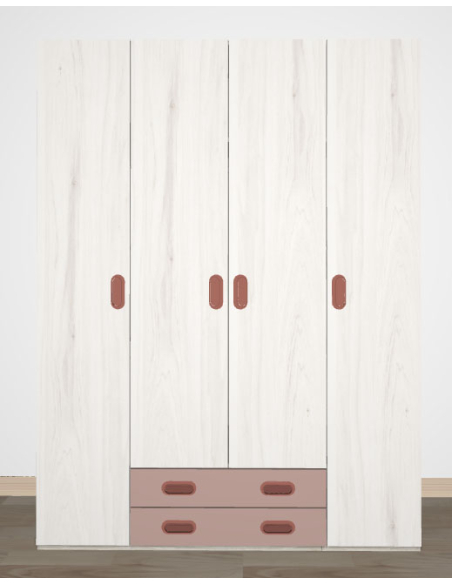 Armario juvenil 4 puertas dos cajones vistos, disponible en siete anchuras diferentes a partir de 164,9 cm, y tres alturas, 220, 240 y 248 cm, combinables entre sí. Echa un vistazo a los acabados para las puertas y combínalo con el tirador que más te guste.
