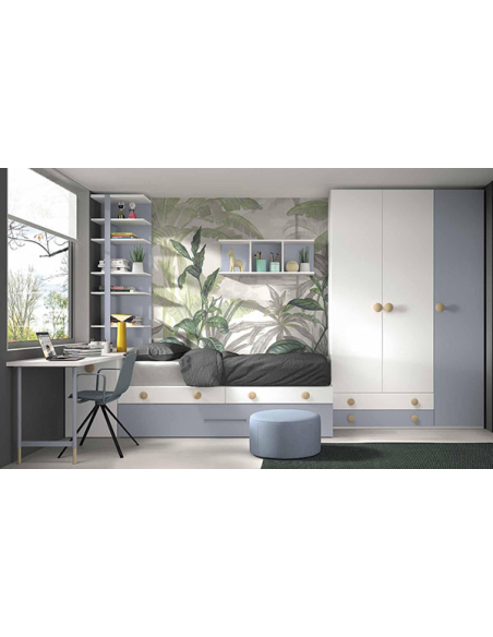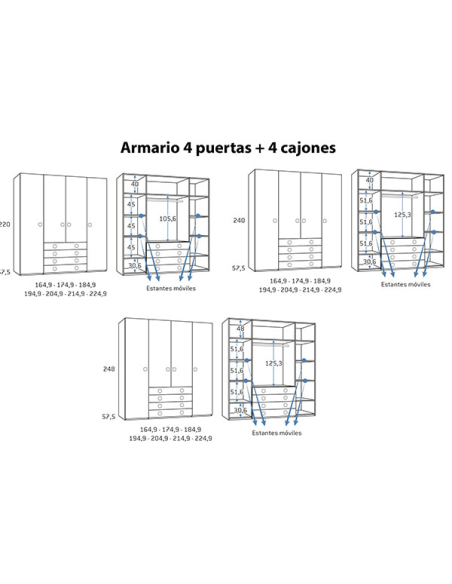 Armario juvenil 4 puertas cuatro cajones vistos, disponible en siete anchuras diferentes a partir de 164,9 cm, y tres alturas, 220, 240 y 248 cm, combinables entre sí. Echa un vistazo a los acabados para las puertas y combínalo con el tirador que más te guste.