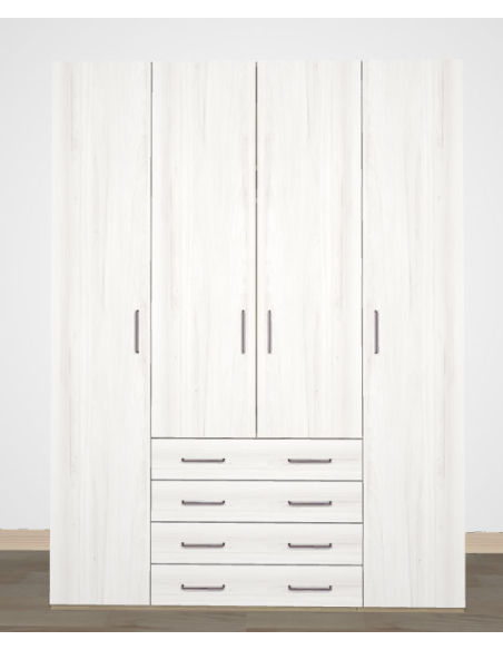 Práctico armario de cuatro puertas batientes y cuatro cajones vistos con sistema de freno, con el cual conseguirás tener todo en orden y organizado en un reducido espacio. Este armario esta dividido en tres partes, el módulo central más ancho, tiene 4 cajones vistos en la parte inferior y en la parte superior estante maletero con una barra para colgar la ropa y los módulos laterales todo estantes. Un imprescindible en las habitaciones tanto a nivel organizativo como compositivo.
