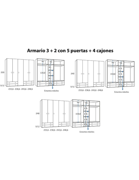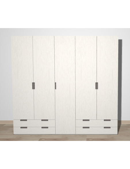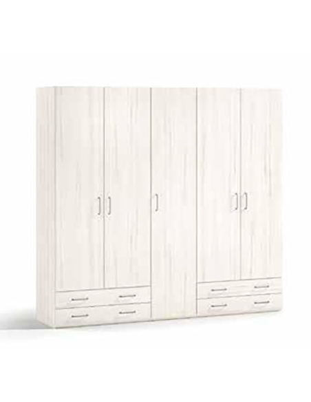 Práctico armario 3+2 de cinco puertas largas y cuatro cajones vistos con el cual conseguirás tener todo en orden y organizado en un reducido espacio. Este armario esta dividido en tres módulos, los dos módulos laterales anchos son de la misma medida y están compuestos por dos cajones vistos en la parte interior y estante maletero con barra de colgar en la parte superior y el módulo central (es el que varía de medida) esta compuesto por estantes móviles para colocarlos a la medida que se necesite. Un imprescindible en las habitaciones tanto a nivel organizativo como compositivo.
