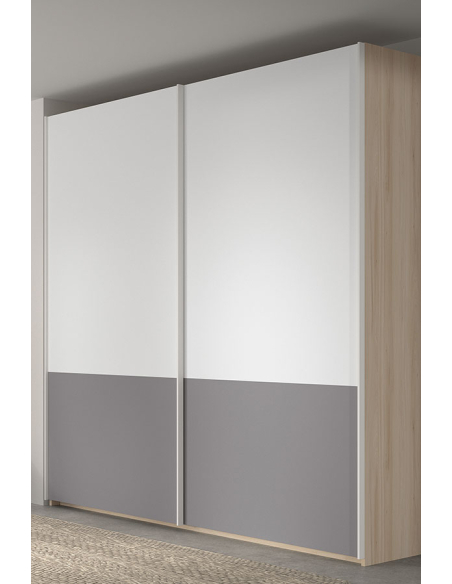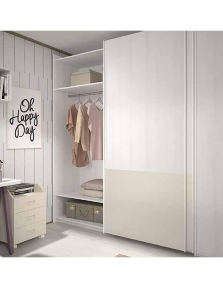 Armario juvenil 2 puertas correderas con 2 paneles, disponible en cinco anchuras diferentes a partir de 122,7 cm, y tres alturas, 220, 240 y 248 cm, combinables entre sí. Echa un vistazo a los acabados para las puertas y combínalo con el acabado que más te guste.