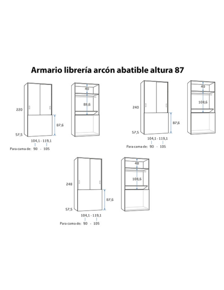 Armario juvenil librería arcón abatible puertas correderas para arcón de altura 87 cm, disponible en dos anchuras de 104,1 y 119,1 cm, y tres alturas, 220, 240 y 248 cm, combinables entre sí. Echa un vistazo a los acabados para las puertas y combínalo con el acabado que más te guste.