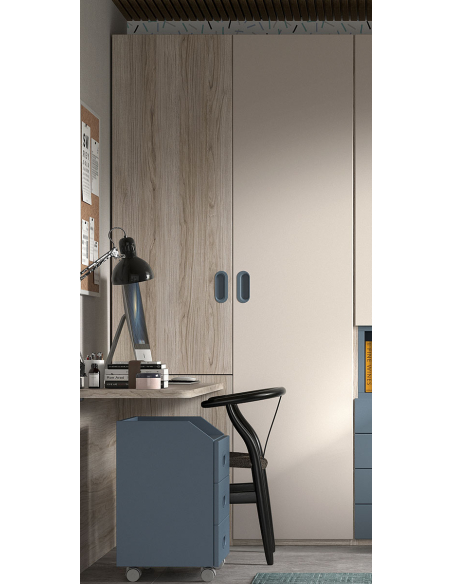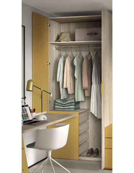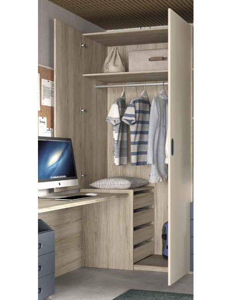 Práctico armario juvenil de rincón preparado con parte ciega para colocar encimera sin perder espacio con el cual conseguirás tener todo en orden y organizado en un reducido espacio. Este armario se coloca cuando el espacio es reducido pudiendo disponer el escritorio a partir de la parte ciega que tiene en una de las puertas y así aprovechar al máximo el espacio. En la parte ciega tiene una cajonera de cuatro cajones y en la parte superior tiene un estante maletero y una barra de colgar.