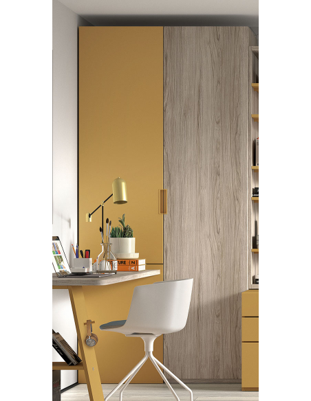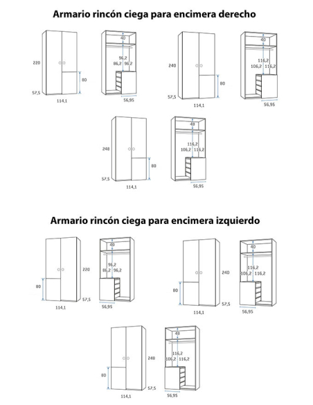 Armario juvenil de rincón con parte ciega para colocar encimera, disponible en medida de 114,1 cm, y tres alturas, 220, 240 y 248 cm, combinables entre sí. Echa un vistazo a los acabados para las puertas y combínalo con el acabado que más te guste.