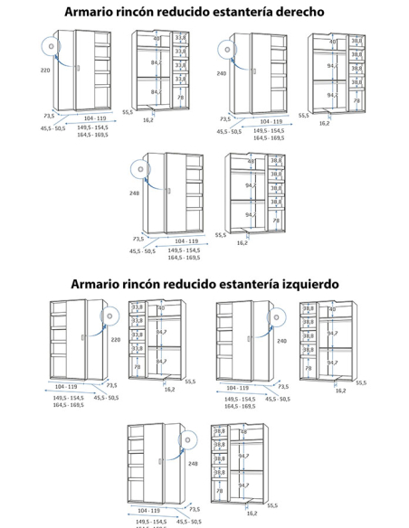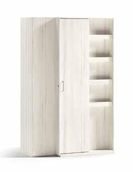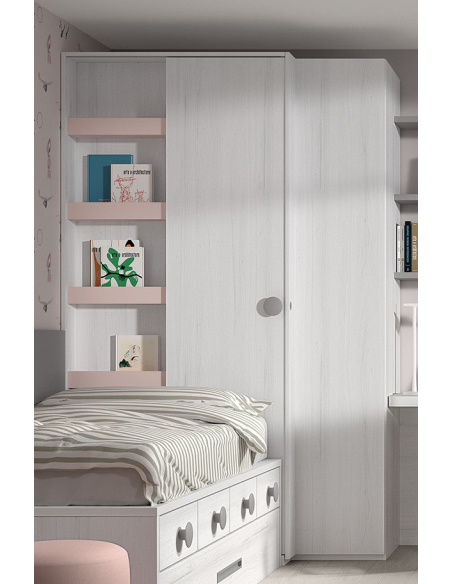 Armario juvenil de rincón reducido con estantería y puerta L batiente, disponible en cuatro medidas a partir de 149,5 cm, y tres alturas, 220, 240 y 248 cm, combinables entre sí. Echa un vistazo a los acabados para las puertas y combínalo con el acabado que más te guste.