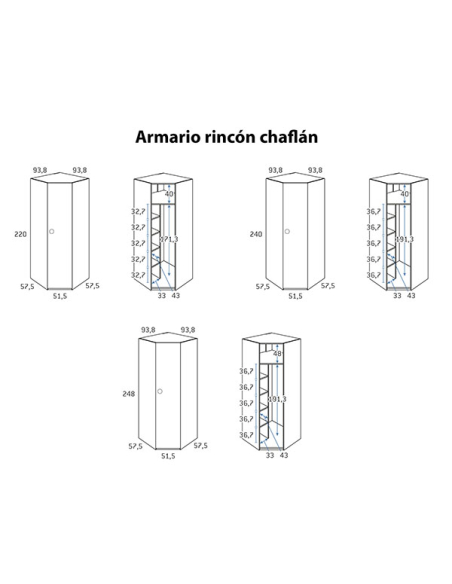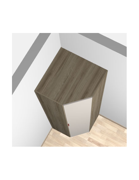 Armario juvenil de rincón chaflán 1 puerta, disponible en medida de 93,8 cm, y tres alturas, 220, 240 y 248 cm, combinables entre sí. Echa un vistazo a los acabados para las puertas y combínalo con el acabado que más te guste.