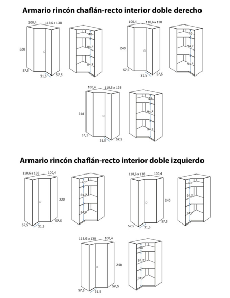 Armario juvenil de rincón chaflán recto interior doble, disponible en tres medidas ancho a partir de 118,6 cm por un lado y por el otro medida fija de 100,4 cm, y tres alturas, 220, 240 y 248 cm, combinables entre sí. Echa un vistazo a los acabados para las puertas y combínalo con el acabado que más te guste.