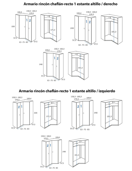 Armario juvenil de rincón chaflán recto puerta plegable sin estantería lateral, disponible en tres medidas ancho a partir de 150,3 cm por un lado y por el otro medida fija de 100,4 cm, y tres alturas, 220, 240 y 248 cm, combinables entre sí. Echa un vistazo a los acabados para las puertas y combínalo con el acabado que más te guste.