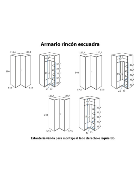 Armario juvenil de rincón escuadra, disponible en medida de 110,4 cm por un lado y por el otro medida de 110,4 cm, y tres alturas, 220, 240 y 248 cm, combinables entre sí. Echa un vistazo a los acabados para las puertas y combínalo con el acabado que más te guste.