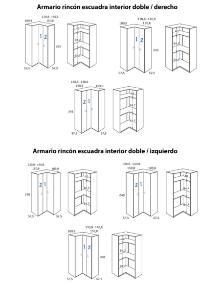 Armario juvenil de rincón escuadra puerta plegable con interior doble, disponible en medida de 109,8 cm por un lado y por el otro en medidas de 130,8, 140,8 y 150,8 cm, y tres alturas, 220, 240 y 248 cm, combinables entre sí. Echa un vistazo a los acabados para las puertas y combínalo con el acabado que más te guste.