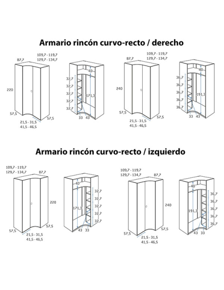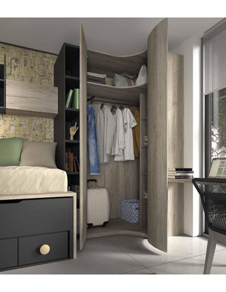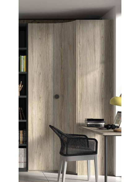 Armario juvenil de rincón curvo-recto, disponible en medida de 87,7 cm por un lado y por el otro en medidas de 109,7, 119,7, 129,7 y 134,7 cm, y dos alturas, 220 y 240 cm, combinables entre sí. Echa un vistazo a los acabados para las puertas y combínalo con el acabado que más te guste.