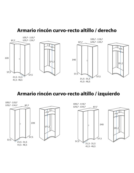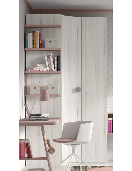 Armario juvenil de rincón curvo-recto sin estantería lateral, disponible en medida de 87,7 cm por un lado y por el otro en medidas de 109,7, 119,7, 129,7 y 134,7 cm, y dos alturas, 220 y 240 cm, combinables entre sí. Echa un vistazo a los acabados para las puertas y combínalo con el acabado que más te guste.