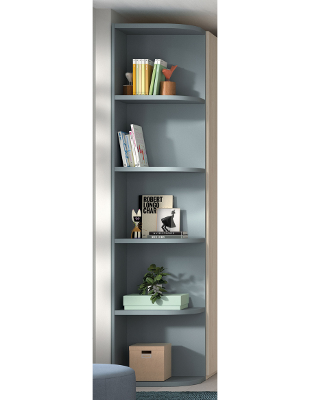 Práctico armario juvenil terminal rinconera con estantes. Aprovechar el espacio al máximo es posible con estos armarios de rincón. Una pieza imprescindible para terminar la composición de armarios de la habitación y que el espacio quede más ligero a la vista, a la vez que disponemos de sus estantes para colocar objetos decorativos, libros, etc.