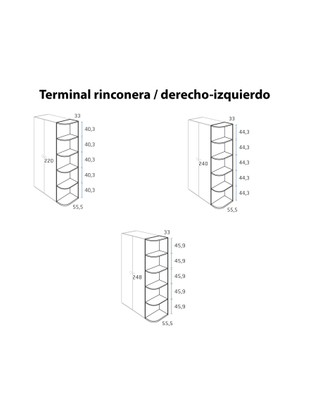 Armario juvenil terminal rinconera con estantes, disponible en medida de 33 cm y tres alturas, 220, 240 y 260 cm, combinables entre sí. Echa un vistazo a los acabados para las puertas y combínalo con el acabado que más te guste.