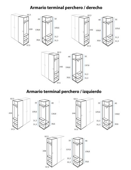 Armario juvenil terminal perchero, disponible en medida de 62,3 cm y tres alturas, 220, 240 y 260 cm, combinables entre sí. Echa un vistazo a los acabados para las puertas y combínalo con el acabado que más te guste.