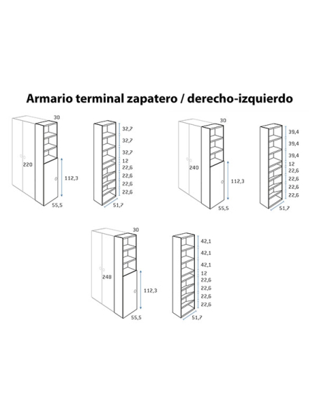 Armario juvenil terminal zapatero con estantes, disponible en medida de ancho de 30 cm y tres alturas, 220, 240 y 260 cm, combinables entre sí. Echa un vistazo a los acabados para las puertas y combínalo con el acabado que más te guste.