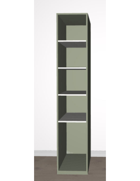 Armario juvenil cuatro estantes, disponible en cinco anchuras diferentes a partir de 42,3 cm, y tres alturas, 220, 240 y 248 cm, combinables entre sí. Echa un vistazo a los acabados para las puertas y combínalo con el tirador que más te guste.