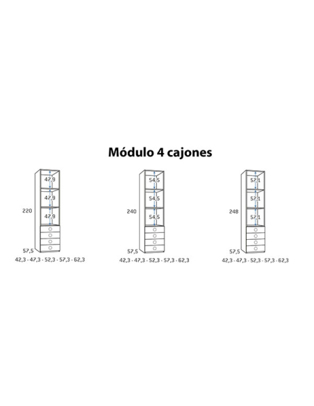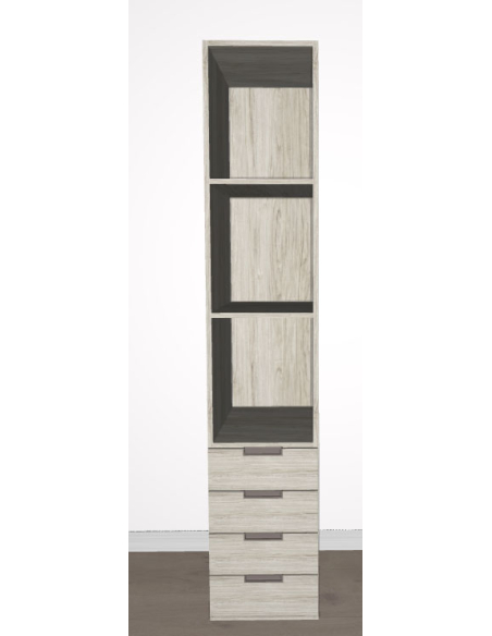 Armario juvenil dos estantes y cuatro cajones, disponible en cinco anchuras diferentes a partir de 42,3 cm, y tres alturas, 220, 240 y 248 cm, combinables entre sí. Echa un vistazo a los acabados para los cajones y combínalo con el tirador que más te guste.