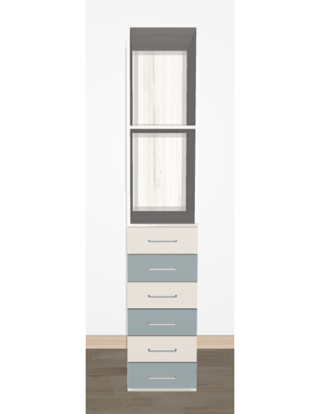 Armario juvenil un estante y seis cajones, disponible en cinco anchuras diferentes a partir de 42,3 cm, y tres alturas, 220, 240 y 248 cm, combinables entre sí. Echa un vistazo a los acabados para los cajones y combínalo con el tirador que más te guste.