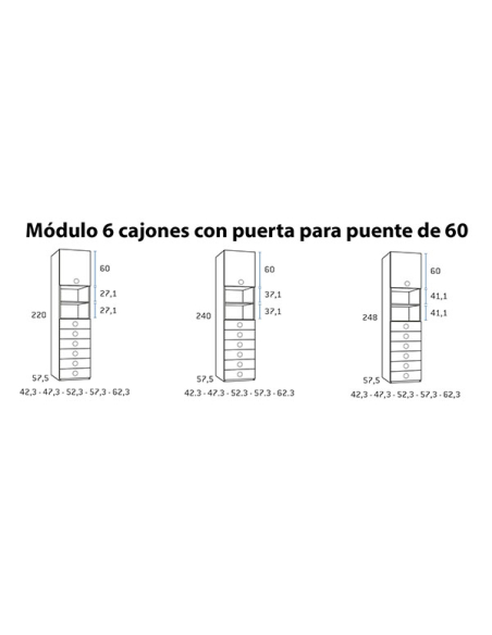 Armario juvenil un estante, seis cajones y puerta, disponible en cinco anchuras diferentes a partir de 42,3 cm, y tres alturas, 220, 240 y 248 cm, combinables entre sí. Echa un vistazo a los acabados para los cajones y puerta y combínalo con el tirador que más te guste.
