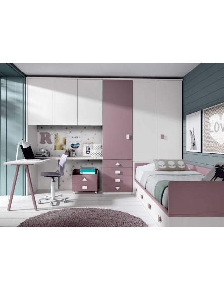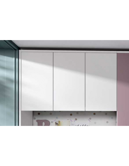 Puente de tres o cuatro puertas sin tirador para habitaciones juveniles totalmente personalizable. Con estas piezas podrás elegir los colores base, los frentes de los cajones y los tiradores que más combinen con el dormitorio o la idea de dormitorio que quieras.