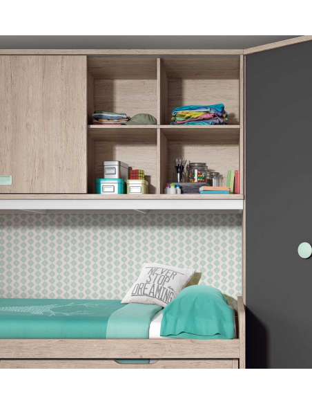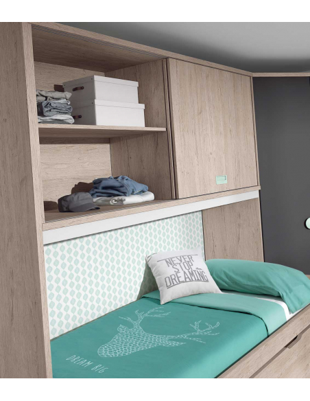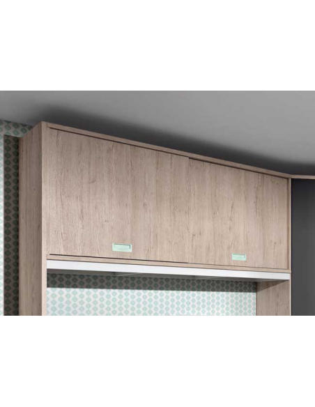 Puente con dos puertas correderas para habitaciones juveniles totalmente personalizable. Con estas piezas podrás elegir los colores base, los frentes de los cajones y los tiradores que más combinen con el dormitorio o la idea de dormitorio que quieras.